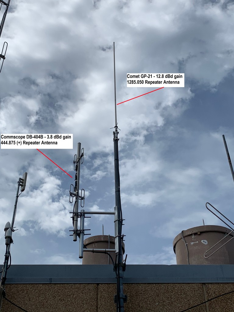 Both the 1285.050 (-) and 444.875 (+) repeaters are fed with about 30′ of Andrew LDF4-50 1/2″ heliax to help minimize system loss.