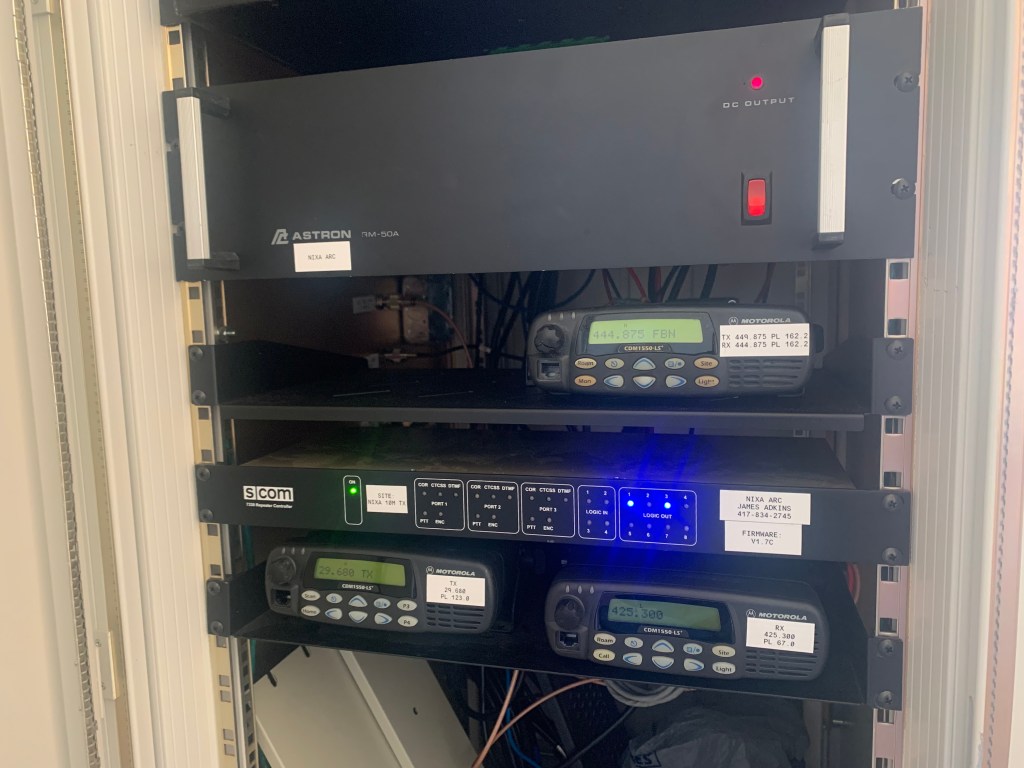 The Kenwood TKR-850 444.875 repeater serves as the “hub” repeater for the Forgotten Bands Network of the Ozarks. It is co-located with the 1285.050 atop Cox South Hospital near US 60 & National Avenue.