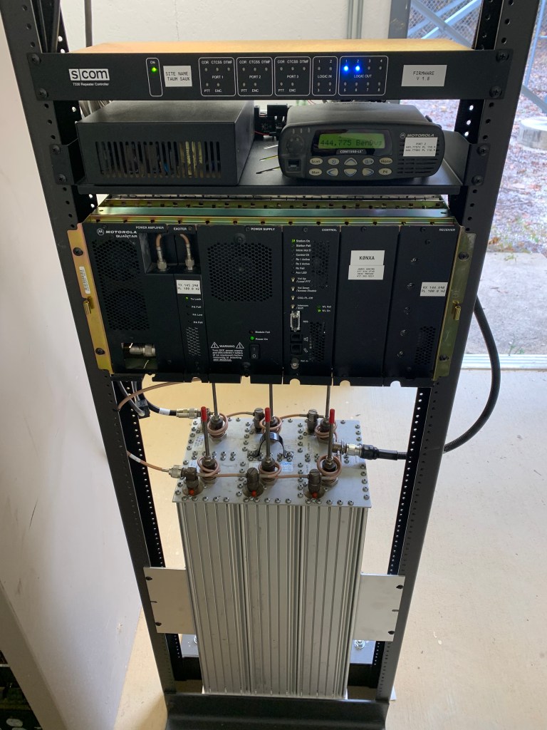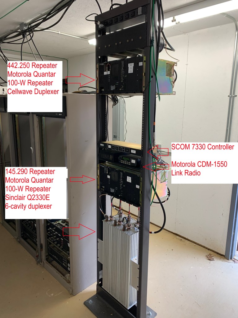 The repeater is a 100-W continuous duty Motorola Quantar repeater. The repeater utilizes an SCOM 7330 repeater controller and a Sinclair Q-2330E 6-cavity duplexer. A Motorola CDM-1250 UHF radio with dedicated Duracomm power supply provide the link back to the 444.775 Bendavis East hub repeater approximately 83 miles to the West!