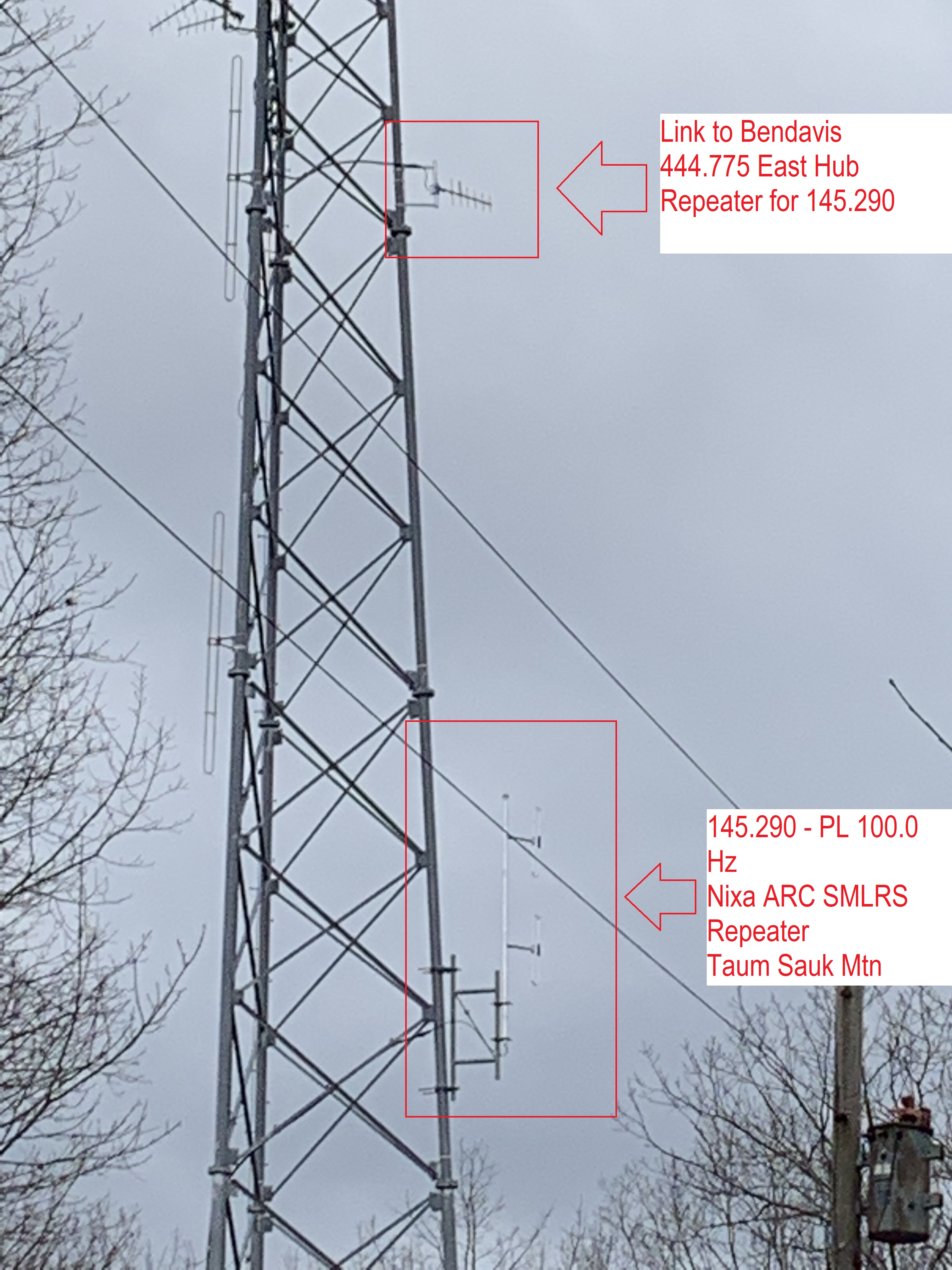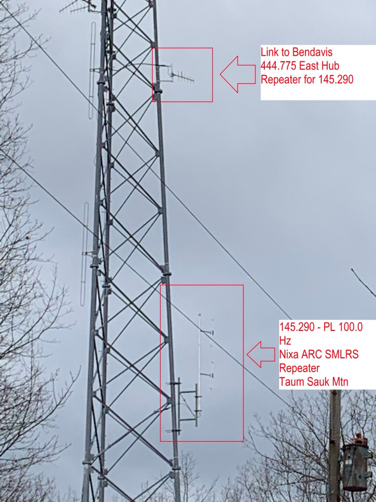 The Repeater antenna is a 5.5 dBd gain Comprod 872F-70TM antenna mounted at 50′ AGL mounted on the West side of the tower. The link antenna to Bendavis is a 10 dBd gain Commscope DB-436C mounted at 60′ AGL.